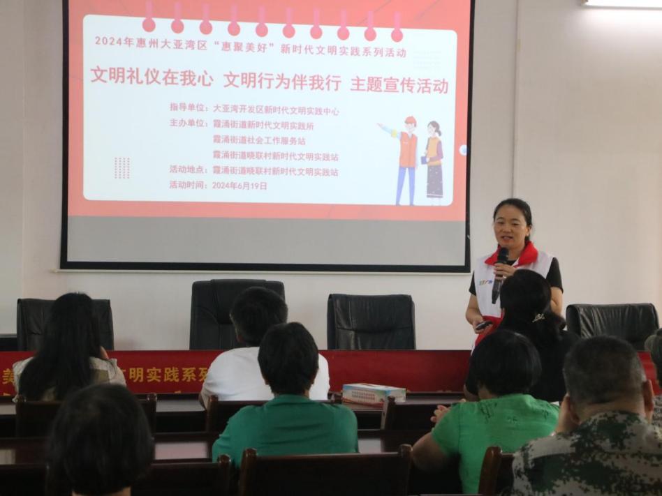 同一天,在霞涌街道曉聯(lián)村新時(shí)代文明實(shí)踐站,小伙伴公益宣講團(tuán)志愿者講師符蘭芳,通過現(xiàn)場授課和觀點(diǎn)問答、分享的形式,將日常生活常見的禮儀常識、溝通表達(dá)、穿著禮儀、公共場合文明行為等多方面進(jìn)行理論分享和情景演示,現(xiàn)場互動(dòng)性十足,學(xué)習(xí)氛圍濃烈。