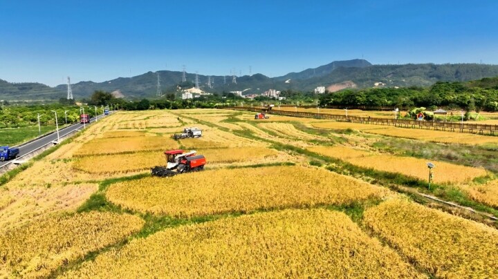 金秋滿地黃,稻谷收獲忙。近期,大亞灣霞涌街道上角村的百畝稻田開鐮收割。